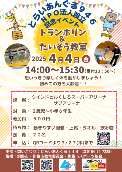 4/4(金)14:00〜15:30『トランポリン&たいそう教室』開催します✨楽しく身体を動かしましょう‼️NPO設立イベントととしてお得にご参加いただけます😊申込は下記フォームからお願いします✨https://forms.gle/fYu6HVzncKsTYavn6ご不明点ございましたらお気軽にご連絡ください🍀