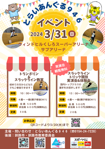 2つのイベントを開催します‼️1つ目はトランポリンとスラックラインの2種目をがっつり‼️楽しんでいただきます😊2つ目はスラックラインの本格競技‼️トリック競技の全国トップクラスの選手にお越しいただき、トリック競技を味わっていただきます✨初心者でも普段味わえない楽しさを感じることができると思います😍大人の方もハマるかもしれません😄もちろんお一人でも‼️お友達とご家族のご参加もOKです😊お申込みはチラシQRコードから🍀またはHPのお知らせから申込みフォームにいけます!ご不明点ありましたらお気軽にご連絡ください✨📞0154-24-7228