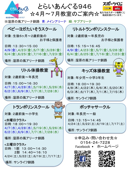緊急事態宣言発令中ではございますが釧路市では体育館が開館されていること、利用継続を願うお声、またお子様の心身の成長やストレス緩和等を考え新型コロナウィルス感染症予防対策を徹底し6月より全教室を実施...
