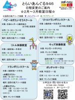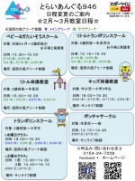●キッズ体操教室●トランポリンスクール (水曜日クラス) (土曜日クラス)●ボッチャサークルまん延防止が延長となり日程変更しておりますのでご確認よろしくお願いします。ご迷惑をお掛けしております。次回、元...